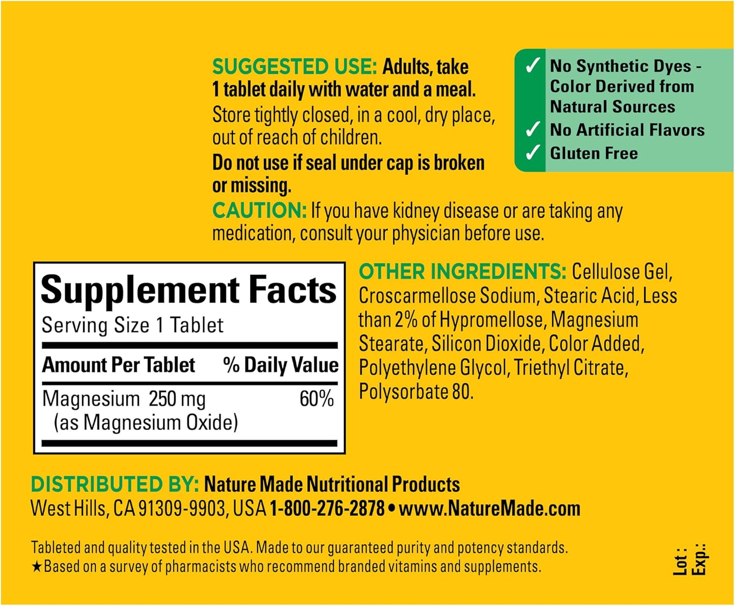 Nature Made Magnesium Oxide 250 mg, Magnesium Supplement for Muscle, Heart, Bone and Nerve Health Support, 200 Tablets, 200 Day Supply