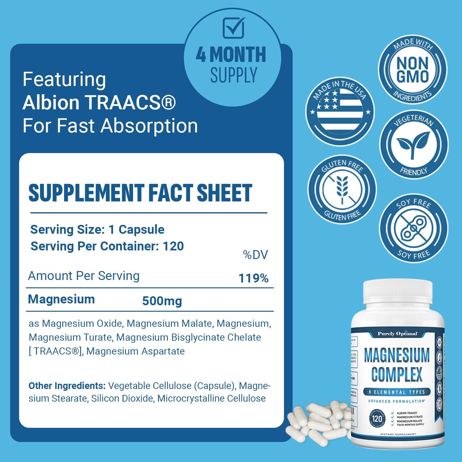A Synergic Blend of 6 Elemental Magnesium: Purely Optimal’s Magnesium Complex Supplement combines citrate, malate, taurate, oxide, aspartate, and bis-glycinate chelate (TRAACSⓇ) for superior absorption, delivering full-spectrum benefits in each capsule.